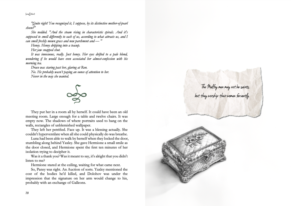 In the wake of the Dark Lord’s triumph over Harry Potter, the defeated must learn their new place. Hermione Granger, former Golden Girl, has been captured and reduced to human chattel. Sold to the highest bidder as the top prize at an auction of Order members and sympathizers, she is thrust into the rabid, waiting hands of the Death Eaters. But despite the horrors of Voldemort’s new world, help—and hope—seem to arise from the most unlikely of places.